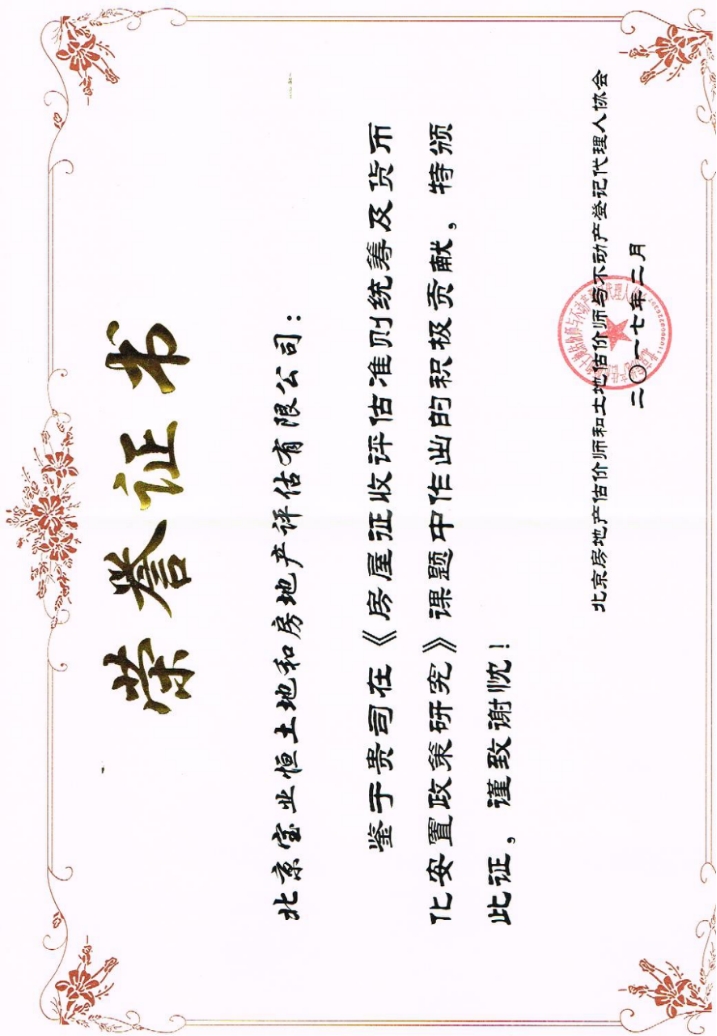 • 《房屋征收評估準(zhǔn)則統(tǒng)籌及貨幣化安置政策研究》課題榮譽證書