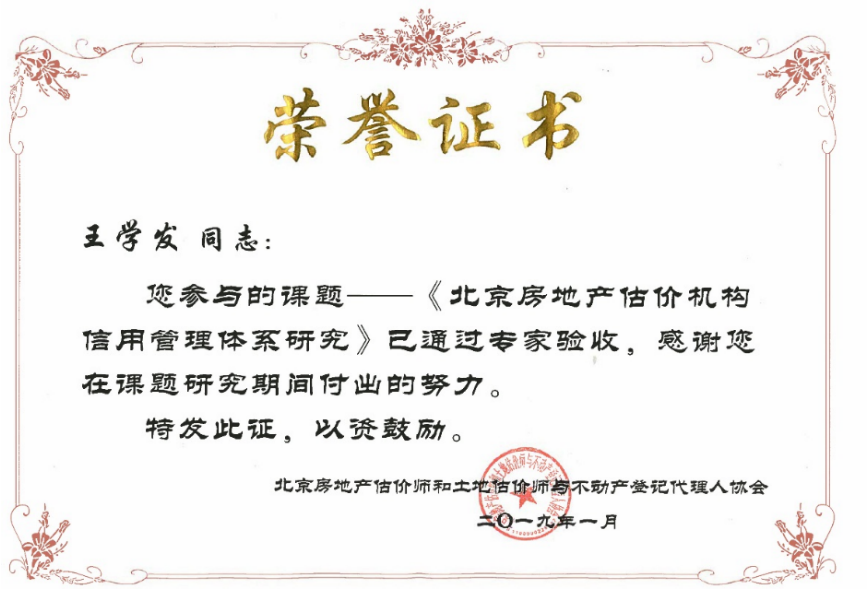 • 《北京房地產(chǎn)估價機構(gòu)信用管理體系研究》通過專家驗收的榮譽證書