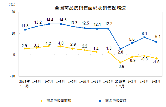1—5月份,商品房銷售面積55518萬平方米,同比下降1.6%,降幅比1—4月份擴大1.3個百分點。其中,住宅銷售面積下降0.7%,辦公樓銷售面積下降12.2%,商業(yè)營業(yè)用房銷售面積下降12.9%。商品房銷售額51773億元,增長6.1%,增速回落2個百分點。其中,住宅銷售額增長8.9%,辦公樓銷售額下降12.3%,商業(yè)營業(yè)用房銷售額下降9.7%。
