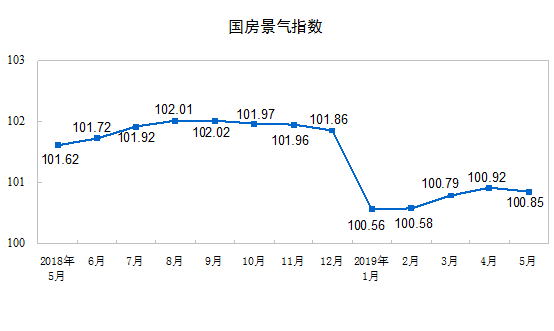 5月份,房地產(chǎn)開發(fā)景氣指數(shù)(簡稱“國房景氣指數(shù)”)為100.85,比4月份回落0.07點。