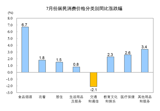 7月份,食品煙酒價(jià)格同比上漲6.7%,影響CPI(居民消費(fèi)價(jià)格指數(shù))上漲約1.95個(gè)百分點(diǎn)。其中,鮮果價(jià)格上漲39.1%,影響CPI上漲約0.63個(gè)百分點(diǎn);畜肉類價(jià)格上漲18.2%,影響CPI上漲約0.75個(gè)百分點(diǎn)(豬肉價(jià)格上漲27.0%,影響CPI上漲約0.59個(gè)百分點(diǎn));雞蛋價(jià)格上漲11.4%,影響CPI上漲約0.06個(gè)百分點(diǎn);禽肉類價(jià)格上漲7.6%,影響CPI上漲約0.09個(gè)百分點(diǎn);鮮菜價(jià)格上漲5.2%,影響CPI上漲約0.12個(gè)百分點(diǎn);糧食價(jià)格上漲0.6%,影響CPI上漲約0.01個(gè)百分點(diǎn)。