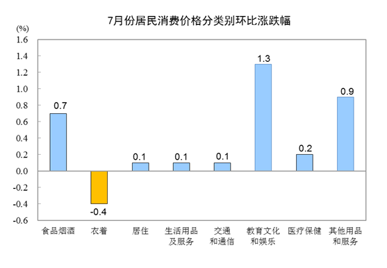 7月份,全國居民消費(fèi)價(jià)格環(huán)比上漲0.4%。其中,城市上漲0.4%,農(nóng)村上漲0.3%;食品價(jià)格上漲0.9%,非食品價(jià)格上漲0.3%;消費(fèi)品價(jià)格上漲0.2%,服務(wù)價(jià)格上漲0.7%。