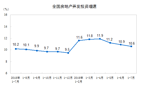 2019年1—7月份,全國房地產(chǎn)開發(fā)投資72843億元,同比增長10.6%,增速比1—6月份回落0.3個(gè)百分點(diǎn)。其中,住宅投資53466億元,增長15.1%,增速回落0.7個(gè)百分點(diǎn)。住宅投資占房地產(chǎn)開發(fā)投資的比重為73.4%。