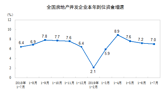 1—7月份,房地產(chǎn)開發(fā)企業(yè)到位資金99800億元,同比增長7.0%,增速比1—6月份回落0.2個(gè)百分點(diǎn)。其中,國內(nèi)貸款15377億元,增長9.5%;利用外資61億元,增長83.6%;自籌資金31032億元,增長2.8%;定金及預(yù)收款33980億元,增長9.6%;個(gè)人按揭貸款15198億元,增長11.3%。