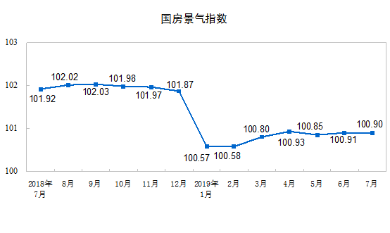7月份,房地產(chǎn)開發(fā)景氣指數(shù)(簡稱“國房景氣指數(shù)”)為100.90,比6月份回落0.01點(diǎn)。