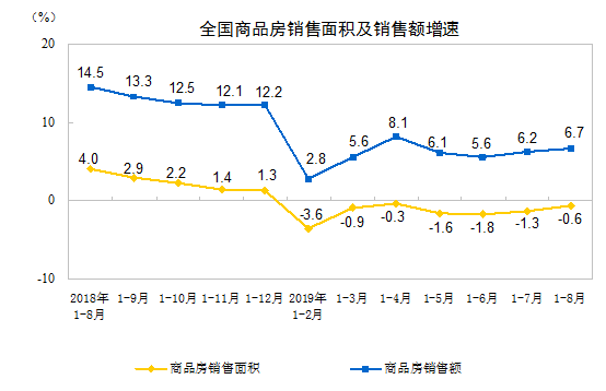 1—8月份,商品房銷售面積101849萬平方米,同比下降0.6%,降幅比1—7月份收窄0.7個百分點。其中,住宅銷售面積增長0.6%,辦公樓銷售面積下降10.8%,商業(yè)營業(yè)用房銷售面積下降13.9%。商品房銷售額95373億元,增長6.7%,增速加快0.5個百分點。其中,住宅銷售額增長9.9%,辦公樓銷售額下降11.7%,商業(yè)營業(yè)用房銷售額下降12.8%。
