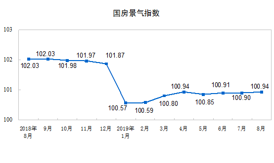 8月份,房地產(chǎn)開發(fā)景氣指數(shù)(簡稱“國房景氣指數(shù)”)為100.94,比7月份提高0.04點。