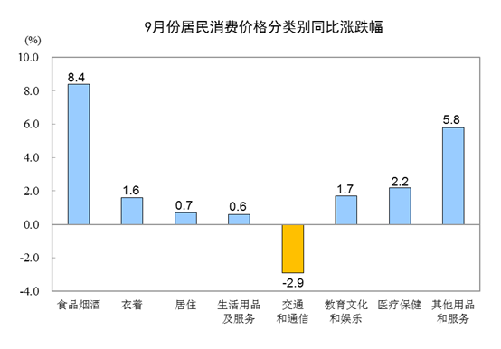 9月份,全國(guó)居民消費(fèi)價(jià)格環(huán)比上漲0.9%。其中,城市上漲0.7%,農(nóng)村上漲1.3%;食品價(jià)格上漲3.5%,非食品價(jià)格上漲0.2%;消費(fèi)品價(jià)格上漲1.5%,服務(wù)價(jià)格下降0.1%。