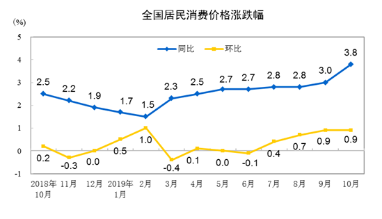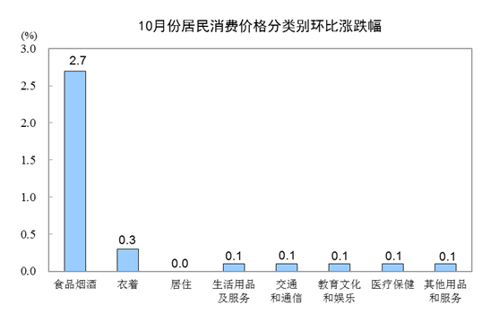 10月份,全國居民消費價格環(huán)比上漲0.9%。其中,城市上漲0.8%,農(nóng)村上漲1.2%;食品價格上漲3.6%,非食品價格上漲0.2%;消費品價格上漲1.4%,服務(wù)價格持平。