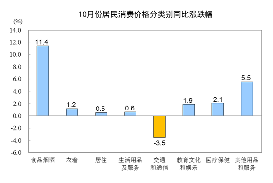 10月份,食品煙酒類價格同比上漲11.4%,影響CPI(居民消費價格指數(shù))上漲約3.37個百分點。食品中,畜肉類價格上漲66.8%,影響CPI上漲約2.92個百分點,其中豬肉價格上漲101.3%,影響CPI上漲約2.43個百分點;禽肉類價格上漲17.3%,影響CPI上漲約0.21個百分點;雞蛋價格上漲12.3%,影響CPI上漲約0.07個百分點;水產(chǎn)品價格上漲2.7%,影響CPI上漲約0.05個百分點;糧食價格上漲0.5%,影響CPI上漲約0.01個百分點;鮮菜價格下降10.2%,影響CPI下降約0.27個百分點;鮮果價格下降0.3%,影響CPI下降約0.01個百分點。