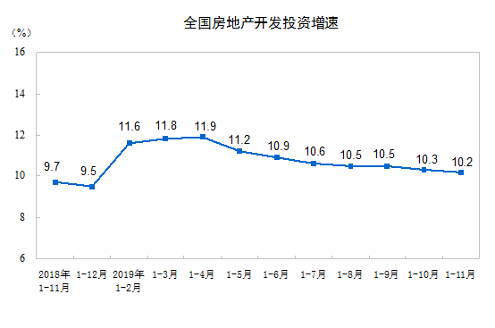2019年1—11月份,全國房地產(chǎn)開發(fā)投資121265億元,同比增長10.2%,增速比1—10月份回落0.1個百分點。其中,住宅投資89232億元,增長14.4%,增速回落0.2個百分點。
