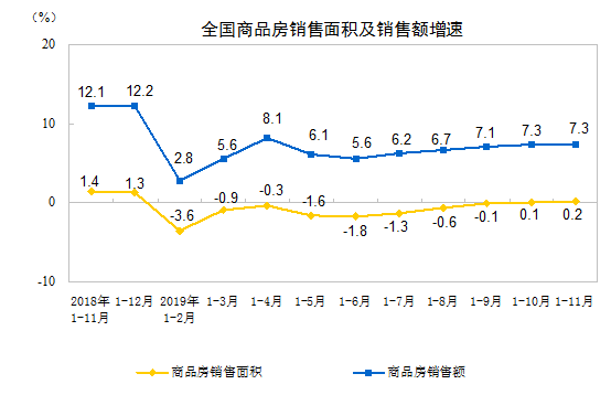 1—11月份,商品房銷售面積148905萬平方米,同比增長0.2%,增速比1—10月份加快0.1個百分點。其中,住宅銷售面積增長1.6%,辦公樓銷售面積下降11.9%,商業(yè)營業(yè)用房銷售面積下降14.1%。商品房銷售額139006億元,增長7.3%,增速持平。其中,住宅銷售額增長10.7%,辦公樓銷售額下降11.3%,商業(yè)營業(yè)用房銷售額下降13.5%。