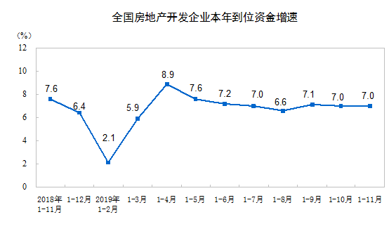 1—11月份,房地產(chǎn)開發(fā)企業(yè)到位資金160531億元,同比增長7.0%,增速與1—10月份持平。其中,國內(nèi)貸款23013億元,增長5.5%;利用外資161億元,增長57.5%;自籌資金52511億元,增長3.7%;定金及預(yù)收款54482億元,增長10.0%;個人按揭貸款24395億元,增長13.9%。