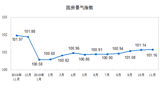 11月份,房地產(chǎn)開發(fā)景氣指數(shù)(簡稱“國房景氣指數(shù)”)為101.16,比10月份提高0.02點。