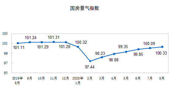 8月份,房地產(chǎn)開(kāi)發(fā)景氣指數(shù)(簡(jiǎn)稱“國(guó)房景氣指數(shù)”)為100.33,比7月份提高0.24點(diǎn)。