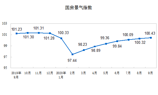 9月份,房地產(chǎn)開發(fā)景氣指數(shù)(簡稱“國房景氣指數(shù)”)為100.43,比8月份提高0.11點。