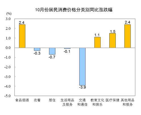 10月份,全國(guó)居民消費(fèi)價(jià)格環(huán)比下降0.3%。其中,城市下降0.3%,農(nóng)村下降0.5%;食品價(jià)格下降1.8%,非食品價(jià)格上漲0.1%;消費(fèi)品價(jià)格下降0.6%,服務(wù)價(jià)格上漲0.1%。