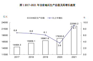 初步核算,全年實現(xiàn)地區(qū)生產(chǎn)總值22590.16億元,按不變價格計算,比上年增長9.1%。其中,第一產(chǎn)業(yè)增加值1286.87億元,增長8.1%,占地區(qū)生產(chǎn)總值比重為5.7%;第二產(chǎn)業(yè)增加值11213.13億元,增長10.2%,占地區(qū)生產(chǎn)總值比重為49.6%;第三產(chǎn)業(yè)增加值10090.16億元,增長8.3%,占地區(qū)生產(chǎn)總值比重為44.7%。人均地區(qū)生產(chǎn)總值64821元,按2021年平均匯率計算為10047美元。