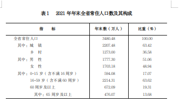 年末全省常住人口3480.48萬人,比上年末減少10.02萬人。其中,城鎮(zhèn)常住人口2207.48萬人,占常住人口比重為63.42%,比上年末提高0.89個百分點。全年全省出生人口24.64萬人,出生率為7.06‰;死亡人口25.54萬人,死亡率為7.32‰;自然增長率為-0.26‰。