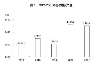 全年全省糧食產(chǎn)量1421.2萬噸,比上年減少3.1萬噸,下降0.2%。其中,夏糧243.4萬噸,增長2.8%;秋糧1177.8萬噸,下降0.8%。