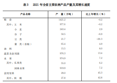 全年全省農(nóng)作物種植面積3588.0千公頃,比上年增加46.5千公頃。其中,糧食種植面積3138.1千公頃,增加8.0千公頃;油料種植面積84.3千公頃,減少4.0千公頃;中草藥材種植面積97.6千公頃,增加20.1千公頃;蔬菜種植面積216.2千公頃,增加27.2千公頃。在糧食種植面積中,玉米種植面積1772.6千公頃,增加30.3千公頃;小麥種植面積536.8千公頃,增加1.0千公頃。果園面積387.7千公頃,增加6.6千公頃。