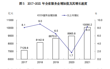 全年全省服務(wù)業(yè)增加值10090.16億元,按不變價格計算,比上年增長8.3%。其中,批發(fā)和零售業(yè)增加值1618.51億元,增長6.1%;交通運輸、倉儲和郵政業(yè)增加值1209.41億元,增長9.7%;住宿和餐飲業(yè)增加值214.59億元,增長17.8%;金融業(yè)增加值1284.00億元,增長4.9%;房地產(chǎn)業(yè)增加值1231.21億元,增長8.3%;信息傳輸、軟件和信息技術(shù)服務(wù)業(yè)增加值502.38億元,增長11.8%;租賃和商務(wù)服務(wù)業(yè)增加值293.35億元,增長4.8%。全年規(guī)模以上服務(wù)業(yè)企業(yè)營業(yè)收入增長32.8%。