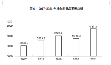 全年全省社會消費品零售總額7747.3億元,比上年增長14.8%。按經(jīng)營地統(tǒng)計,城鎮(zhèn)消費品零售額6376.7億元,增長14.5%;鄉(xiāng)村消費品零售額1370.5億元,增長16.5%。按消費類型統(tǒng)計,商品零售額6992.9億元,增長13.1%;餐飲收入754.4億元,增長33.9%。