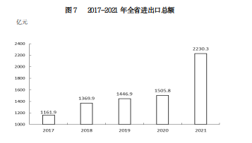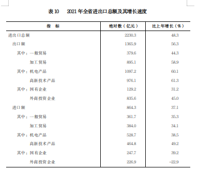 八、對外開放 全年全省進出口總額2230.3億元,比上年增長48.3%。其中,進口額864.3億元,增長37.1%;出口額1365.9億元,增長56.3%。