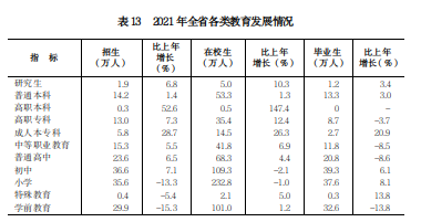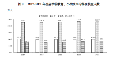 年末全省共有上市公司41家。全省轄區(qū)證券市場各類證券成交額89096.9億元,增長12.6%。其中,股票成交額37814.2億元,增長25.9%;基金成交額1347.8億元,增長24.7%;債券成交額48841.4億元,增長1.9%。年末投資者證券賬戶開戶數(shù)580.0萬戶,增長14.0%。 全年全省保費收入997.5億元,增長7.3%。其中,壽險業(yè)務(wù)保費收入578.5億元,增長11.9%;健康險業(yè)務(wù)保費收入166.9億元,增長6.4%;意外險業(yè)務(wù)保費收入21.7億元,增長4.2%;財產(chǎn)險業(yè)務(wù)保費收入230.5億元,下降1.8%。全年支付各類賠款及給付337.0億元,增長8.8%。 十、教育和科學(xué)技術(shù) 年末全省共有幼兒園7252所,小學(xué)4668所,初中1538所,普通高中517所,中等職業(yè)教育學(xué)校411所,普通高等學(xué)校82所,成人高等學(xué)校9所。全省學(xué)前教育毛入園率95.78%,小學(xué)學(xué)齡兒童凈入學(xué)率99.99%,高中階段毛入學(xué)率95.47%。