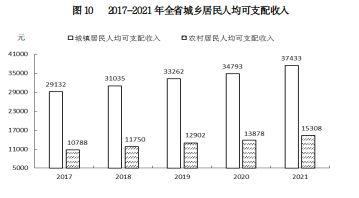 全年全省專利授權(quán)量37379件,增長36.9%。其中,發(fā)明專利授權(quán)量3915件,增長31.1%。國家級企業(yè)技術(shù)中心31家,省級企業(yè)技術(shù)中心413家。 年末全省有氣象臺站109個,開展電話天氣自動答詢的臺站11個。全省氣象系統(tǒng)開展人工影響天氣業(yè)務(wù)的單位118個,防雹、增雨累計受益面積為全省域內(nèi),增雨量45.1億立方米。全省有天氣預(yù)報服務(wù)Intel網(wǎng)站1個,衛(wèi)星云圖接收站8個。 年末全省有專業(yè)綜合地震臺站5個,省級地震臺網(wǎng)中心1個,省級數(shù)字測震地震臺網(wǎng)1個。全年全省發(fā)生M3.0級以上地震2次,最大震級為M3.1級。 十一、文化旅游、衛(wèi)生健康和體育 年末全省共有文化館130個, 文化站1350個(其中,鄉(xiāng)鎮(zhèn)綜合文化站1141個)。公共圖書館128個。出版報紙54種(不含高校校報)、22.5億份,各類期刊198種、1902.4萬冊,各類圖書4051種、7744.0萬冊。廣播電視臺112座,中短波轉(zhuǎn)播發(fā)射臺18座,調(diào)頻、電視轉(zhuǎn)播發(fā)射臺182座,一百瓦以上電視轉(zhuǎn)播發(fā)射臺154座。 全年全省重點監(jiān)測景區(qū)的接待人數(shù)3991.5萬人次,比上年下降0.1%;門票收入11.2億元,增長44.7%;經(jīng)營收入42.7億元,下降8.8%。 年末全省共有衛(wèi)生機構(gòu)(含診所、村衛(wèi)生室) 4.1萬個,床位22.9萬張。專業(yè)公共衛(wèi)生機構(gòu)433個,婦幼保健院(所、站)129個。全省衛(wèi)生機構(gòu)共有衛(wèi)生技術(shù)人員28.2萬人。衛(wèi)生院衛(wèi)生技術(shù)人員2.4萬人,其中,農(nóng)村鄉(xiāng)鎮(zhèn)衛(wèi)生院衛(wèi)生技術(shù)人員2.2萬人。社區(qū)衛(wèi)生服務(wù)中心(站)衛(wèi)生技術(shù)人員1.3萬人,專業(yè)公共衛(wèi)生機構(gòu)技術(shù)人員1.7萬人,婦幼保?。ㄋ⒄荆┬l(wèi)生技術(shù)人員1.1萬人。截至年末,全省累計報告新型冠狀病毒肺炎確診病例139例,累計治愈出院病例138例,累計死亡0人。 年末全省有體育場地面積8389.0萬平方米;體育場地112588個,基礎(chǔ)大項場地數(shù)量為5720個,球類運動場地60623個,冰雪運動場地53個,體育健身場地41723個,大型體育場館56個。全年我省運動員在國內(nèi)外重大比賽中獲金、銀、銅牌分別為40枚、28枚和38枚(包括非奧運項目比賽)。全年全省經(jīng)常參加體育鍛煉人數(shù)1290萬人,開展全民健身項目100項。全年全省銷售中國體育彩票36.5億元,增長49.7%。 十二、居民收入消費和社會保障 全年全省居民人均可支配收入27426元,比上年增長8.8%;居民人均消費支出17191元,增長9.3%。按常住地分,城鎮(zhèn)居民人均可支配收入37433元,增長7.6%,城鎮(zhèn)居民人均消費支出21965元,增長8.0%;農(nóng)村居民人均可支配收入15308元,增長10.3%,農(nóng)村居民人均消費支出11410元,增長10.9%。按全省居民五等份收入分組,城鎮(zhèn)低收入組人均可支配收入16079元,增長9.4%;農(nóng)村低收入組人均可支配收入6236元,增長13.5%。