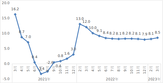 2021年3月-2023年3月全省固定資產(chǎn)投資增長情況