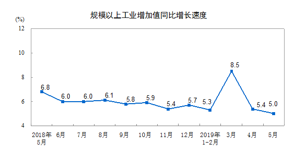 2019年5月份,規(guī)模以上工業(yè)增加值同比實(shí)際增長(zhǎng)5.0%(以下增加值增速均為扣除價(jià)格因素的實(shí)際增長(zhǎng)率),比4月份回落0.4個(gè)百分點(diǎn)。從環(huán)比看,5月份,規(guī)模以上工業(yè)增加值比上月增長(zhǎng)0.36%。1-5月份,規(guī)模以上工業(yè)增加值同比增長(zhǎng)6.0%。