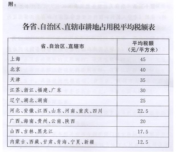 各地區(qū)耕地占用稅的適用稅額,由省、自治區(qū)、直轄市人民政府根據(jù)人均耕地面積和經(jīng)濟(jì)發(fā)展等情況,在前款規(guī)定的稅額幅度內(nèi)提出,報(bào)同級人民代表大會常務(wù)委員會決定,并報(bào)全國人民代表大會常務(wù)委員會和國務(wù)院備案。各省、自治區(qū)、直轄市耕地占用稅適用稅額的平均水平,不得低于本法所附《各省、自治區(qū)、直轄市耕地占用稅平均稅額表》規(guī)定的平均稅額。